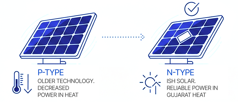 At Ish Solar we use N-Type cells. Compared to the older P-Type panels, N-Type panels perform better in hot weather. When the efficiency of normal panels decreases in the hot climate of Gujarat, Ish Solar’s modules continue to generate power continuously.