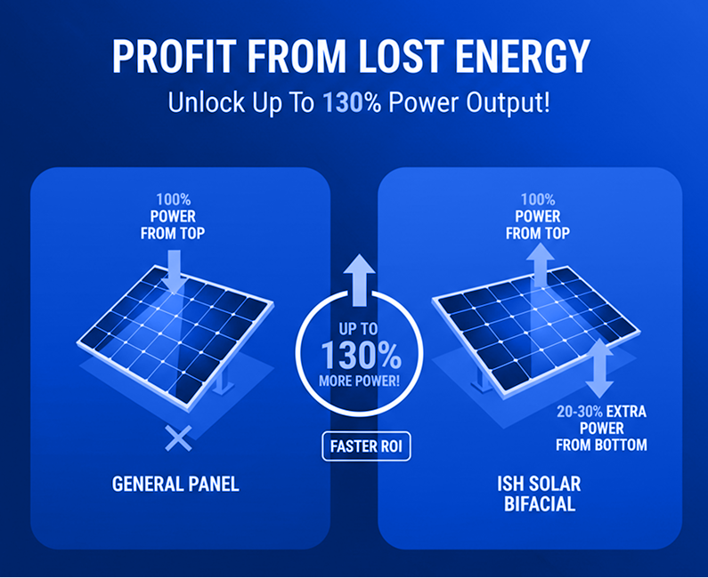 If you are installing solar today and still choose the old single-sided panels, you are missing out on 30% of free energy. Ish Solar gives you back the energy that was previously lost in the ground. A smart businessman is one who keeps track of every ray.